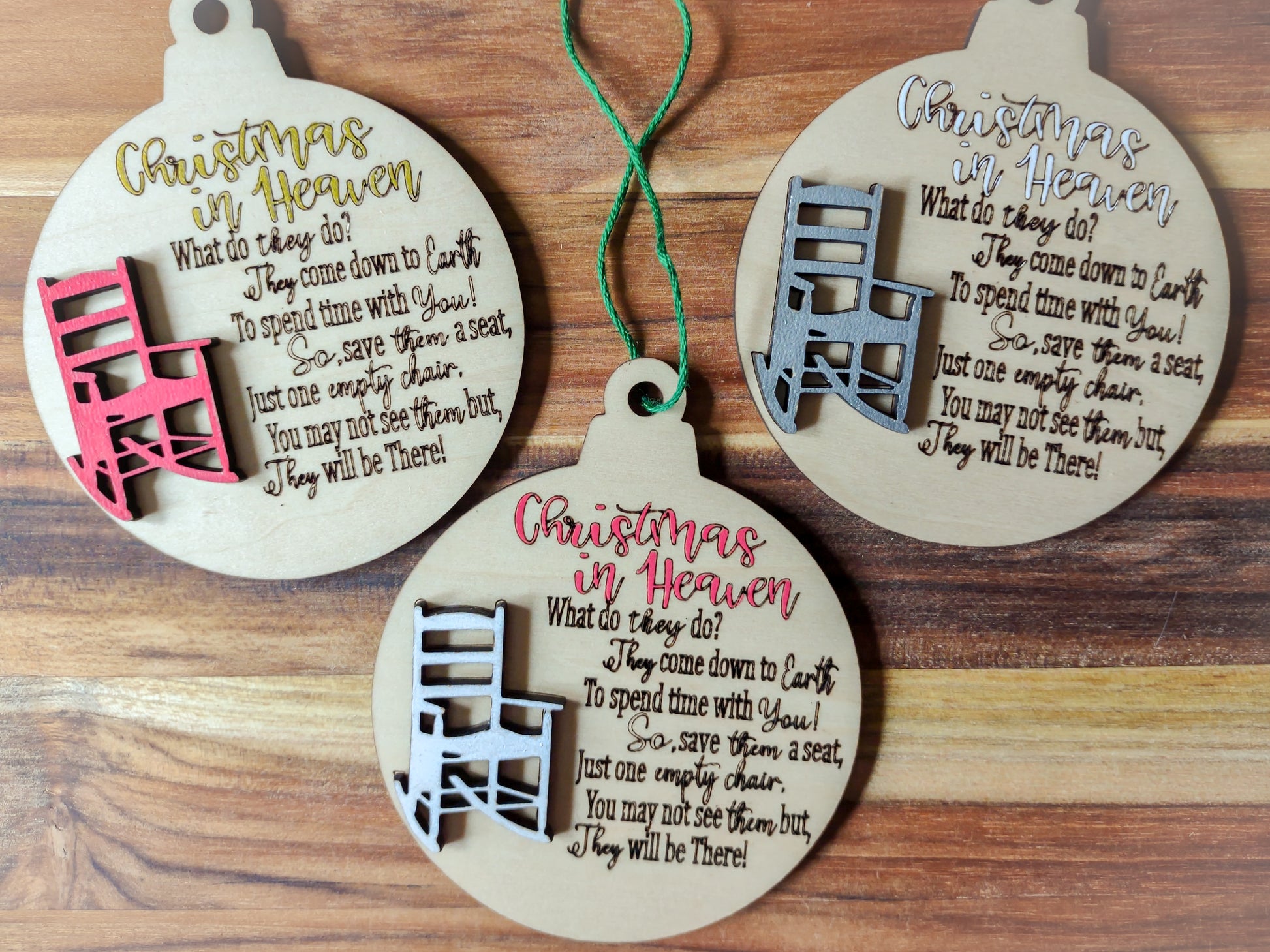Remember your loved ones with these beautiful ornaments, adorned with a message on the front and a 3D chair. Optional engraving is available for the backside- handwriting, a signature, or anything you'd like.