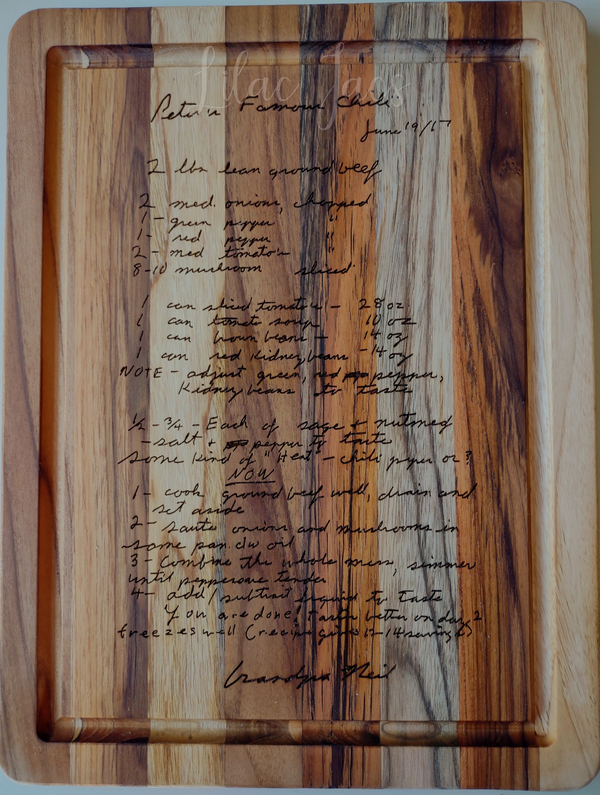 This custom-engraved keepsake is the perfect way to preserve an heirloom recipe for years to come. Our process is simple, you send us a photo of your recipe, we hand trace it, engrave it on a beautiful board, and send it to you. When ordering, please note if there is anything in the recipe you'd like to add (ie. a signature, a date, etc) or remove (ie. scribbles, typos, etc). In general, all stains and lines will be removed to isolate the handwriting.