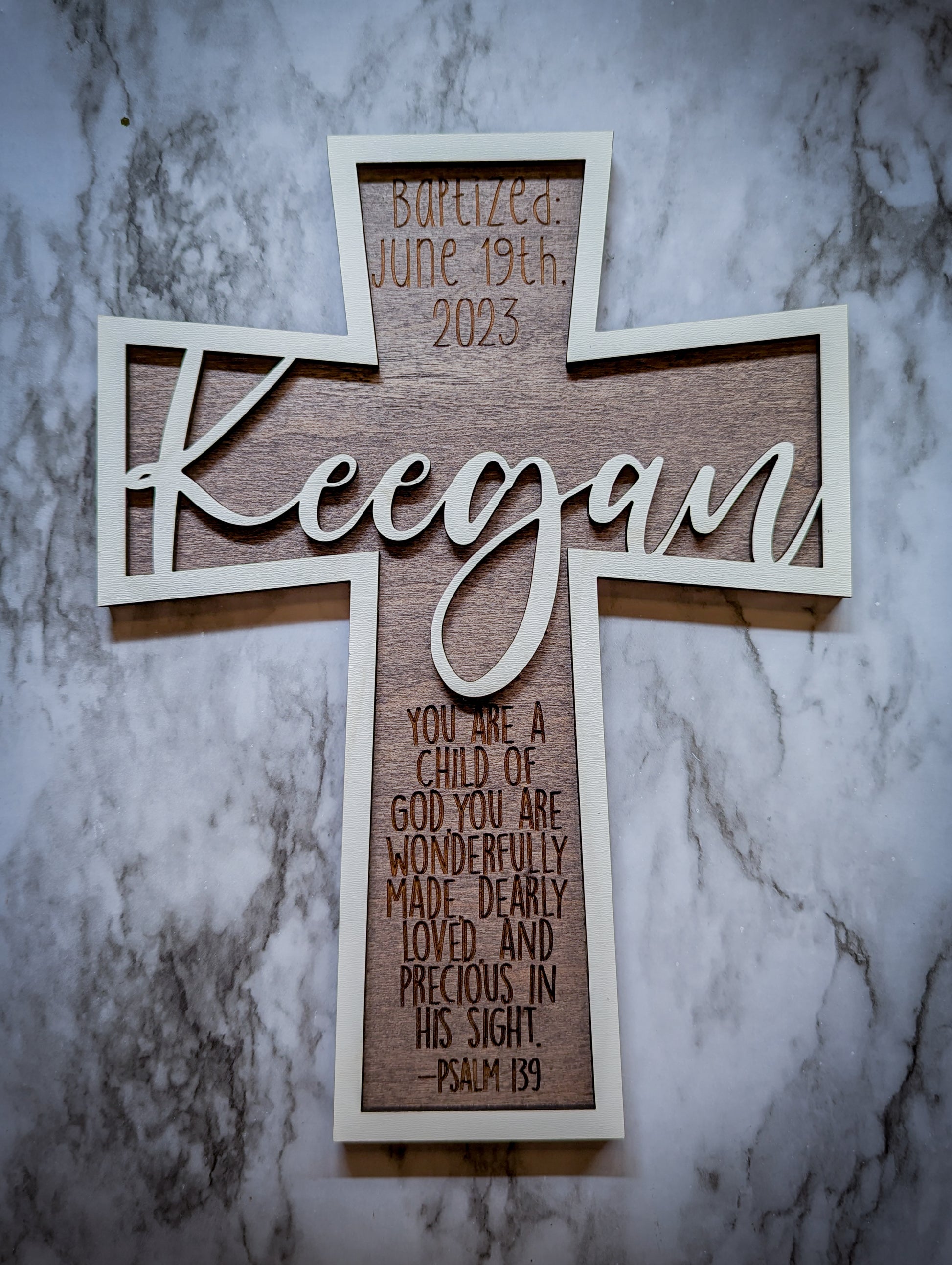 Our personalized wooden cross offers an elegant and timeless way to commemorate a special religious moment. Choose from a two-layer design or cut-outs to personalize this modern gift. Made with maple wood and fully customizable with name, dates, and chosen verse, this beautiful and personal piece is the perfect way to treasure a special religious ceremony such as a baptism, or confirmation, and it would also make a great gift for a religious friend, teacher, or volunteer.